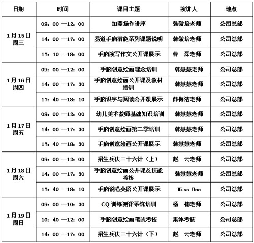 應全國易道部落老師強烈要求,易道教育將于01月15日在合肥總部舉行新一期易道部落師資培訓,望全國各地有意加盟易道教育以及對幼兒教育發展感興趣的老師們前來考察學習,名額有限,報名從速!欲知詳情請聯系加盟事業部夏曼老師,咨詢電話:0551-62551875。總部地址:中國 安徽省 合肥市 長江中路98號 銀泰中心寫字樓22層,易道中國加盟熱線:400-676-6760。